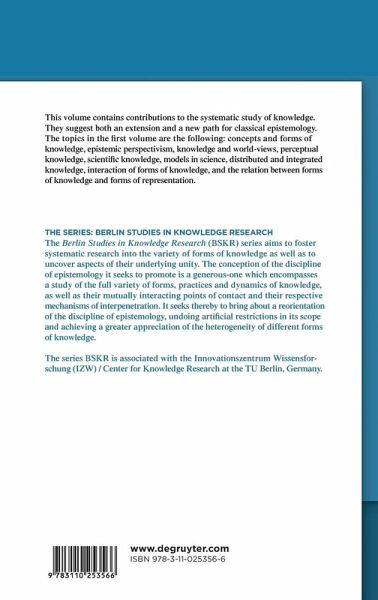 Der Band umfasst Beiträge zur "systematischen Wissensforschung". Zugleich wird eine Erweiterung und Neuausrichtung der klassischen Epistemologie vorgeschlagen. Themenfelder im ersten der beiden eröffnenden Bände sind: Begriffe und Formen von Wissen (z.B. theoretisches, praktisches, technisches, moralisches, ästhetisches Wissen); Epistemische Perspektivität; Praktiken und Dynamiken von Wissen; Wissen und Weltbilder; Wissensforschung als transdisziplinäre Grundlagenforschung und Reflexionswissenschaft; Perzeptuelles Wissen; Wissen in den Wissenschaften; Modellierung von Wissen; distribuiertes und integriertes Wissen; Formen des Wissens und Formen der Repräsentation; Wissensformen und Kreativität.