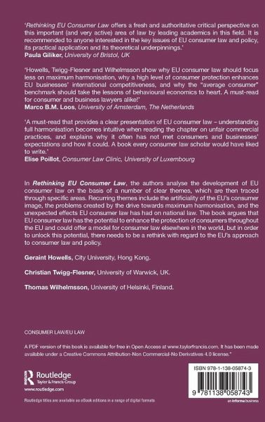 In this book, the authors analyse the development of EU consumer law, arguing that it has the potential of enhancing the protecting of consumers throughout the EU and could offer a model elsewhere in the world, but in order to unlock this potential, there needs to be a rethink with regard to the EU's approach to consumer law and policy.
