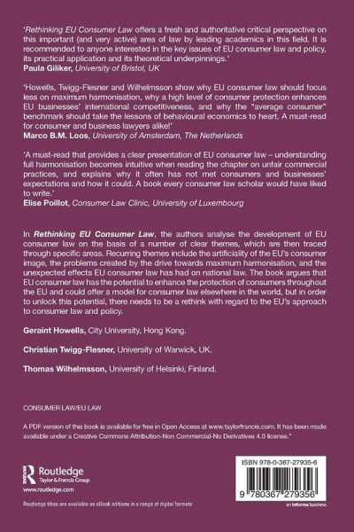 In this book, the authors analyse the development of EU consumer law, arguing that it has the potential of enhancing the protecting of consumers throughout the EU and could offer a model elsewhere in the world, but in order to unlock this potential, there needs to be a rethink with regard to the EU's approach to consumer law and policy.