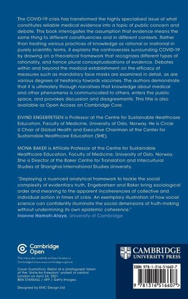 The COVID-19 crisis has transformed the highly specialized issue of what constitutes reliable medical evidence into a topic of public concern and debate. This book interrogates the assumption that evidence means the same thing to different constituencies and in different contexts. Rather than treating various practices of knowledge as rational or irrational in purely scientific terms, it explains the controversies surrounding COVID-19 by drawing on a theoretical framework that recognizes different types of rationality, and hence plural conceptualizations of evidence. Debates within and beyond the medical establishment on the efficacy of measures such as mandatory face masks are examined in detail, as are various degrees of hesitancy towards vaccines. The authors demonstrate that it is ultimately through narratives that knowledge about medical and other phenomena is communicated to others, enters the public space, and provokes discussion and disagreements. This title is also available as Open Access on Cambridge Core.