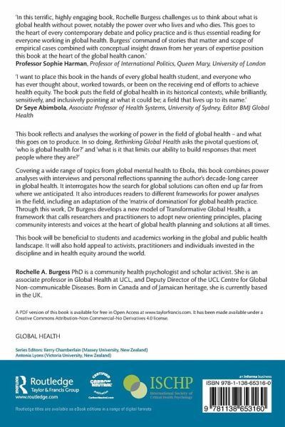 Covering a wide range of topics from global mental health to Ebola, this book combines power analyses with interviews and personal reflections spanning the author's decade-long career in global health. It interrogates how the search for global solutions can often end up far from where we anticipated. It also introduces readers to different frameworks for power analyses in the field, including an adaptation of the 'matrix of domination' for global health practice. Through this work, Dr Burgess develops a new model of Transformative Global Health, a framework that calls researchers and practitioners to adopt new orienting principles, placing community interests and voices at the heart of global health planning and solutions at all times.