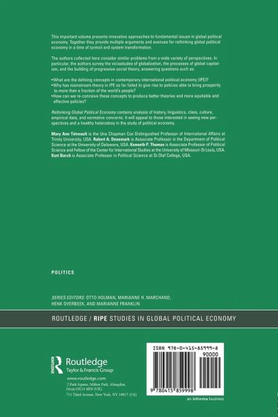 Rethinking Global Political Economy contains incisive analysis of history, linguistics, class, culture, empirical data and normative concerns. This important volume presents innovative approaches to fundamental issues in global political economy. Together they provide multiple arguments and avenues for rethinking global political economy in a time of turmoil and system transformation. It will appeal to those interested in seeing new perspectives and healthy heterodoxy in the study of political economy.