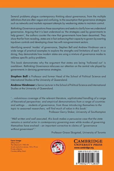 Several problems plague contemporary thinking about governance. From the multiple definitions that are often vague and confusing, to the assumption that governance strategies, networks and markets represent attempts by weakening states to maintain control. Rethinking Governance questions this view and seeks to clarify how we understand governance. Arguing that it is best understood as 'the strategies used by governments to help govern', the authors counter the view that governments have been decentred. They show that far from receding, states are in fact enhancing their capacity to govern by developing closer ties with non-government sectors. Identifying five 'modes' of government (governance through hierarchy, persuasion, markets and contracts, community engagement, and network associations), Stephen Bell and Andrew Hindmoor use practical examples to explore the strengths and limitations of each. In so doing, they demonstrate how modern states are using a mixture of governance modes to address specific policy problems. This book demonstrates why the argument that states are being 'hollowed out' is overblown.