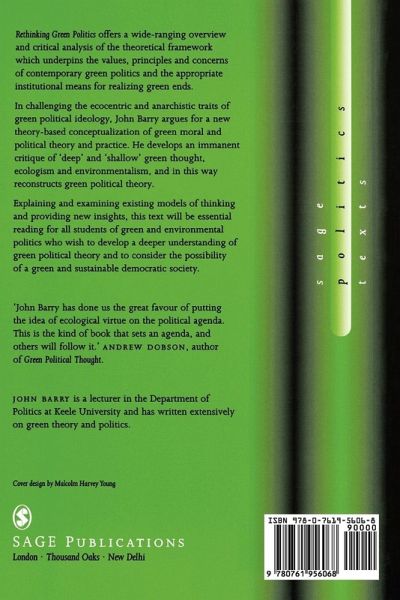 Rethinking Green Politics offers a wide-ranging and critical analysis of the theoretical framework that underpins the values, principles and concerns of contemporary green politics. John Barry challenges the ecocentric and anarchistic traits of much green political ideology; proposes that we rethink green politics by refocusing attention away from ideology to theory; and develops an important critique and reconstruction of existing conceptualizations such as those around 'deep' and 'shallow' green thinking, or 'ecologism' and 'environmentalism'.