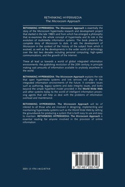 Rethinking Hypermedia: The Microcosm Approach is essentially the story of the Microcosm hypermedia research and development project that started in the late 1980's and from which has emerged a philosophy that re-examines the whole concept of hypermedia and its role in the evolution of multimedia information systems. The book presents the complete story of Microcosm to date. It sets the development of Microcosm in the context of the history of the subject from which it evolved, as well as the developments in the wider world of technology over the last two decades including personal computing, high-speed communications, and the growth of the Internet. These all lead us towards a world of global integrated information environments: the publishing revolution of the 20th century, in principle making vast amounts of information available to anybody anywhere in the world.