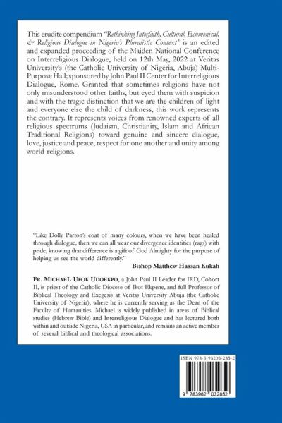 This erudite compendium "Rethinking Interfaith, Cultural, Ecumenical, and Religious Dialogue in Nigeria's Pluralistic Context," is an edited and expanded proceeding of the Maiden National Conference on Interreligious Dialogue, held on 12th May, 2022 at Veritas University's (the Catholic University of Nigeria, Abuja) Multi-Purpose Hall; sponsored by John Paul II Center for Interreligious Dialogue, Rome. Granted that sometimes religions have not only misunderstood other faiths, but eyed them with suspicion and with the tragic distinction that we are the children of light and everyone else the child of darkness, this work represents the contrary. It represents voices from renowned experts of all religious spectrums (Judaism, Christianity, Islam and African Traditional Religions) toward genuine and sincere dialogue, love, justice and peace, respect for one another and unity among world religions.-Fr. Prof. Michael Ufok UdoekpoVeritas University, Abuja"Like Dolly Parton's coat of manycolours, when we have been healed through dialogue, then we can all wear our divergence identities (rags) with pride, knowing that difference is a gift of God Almighty for the purpose of helping us see the world differently."-Bishop Matthew Hassan Kukah