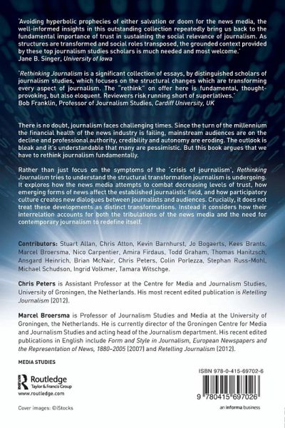 Introduction Rethinking Journalism: The Structural Transformation of a Public Good Marcel Broersma and Chris Peters Part 1: Public Trust in Journalism 1. Trust, Cynicism, and Responsiveness: The Uneasy Situation of Journalism in Democracy Kees Brants 2. A Refractured Paradigm: Journalism, Hoaxes and the Challenge of Trust Marcel Broersma 3. Getting the Facts Straight in a Digital Era: Journalistic Accuracy and Trustworthiness Colin Porlezza and Stephan Russ-Mohl 4. The Postmodern Challenge to Journalism: Strategies for Constructing a Trustworthy Identity Jo Bogaerts and Nico Carpentier Part 2: Participatory Forms of Journalism 5. Trust, Truth and Objectivity: Sustaining Quality Journalism in the Era of the Content-Generating User Brian McNair 6. News Making as an Interactive Practice: Global News Exchange and Network Journalism Ansgard Heinrich 7. Between Networks and 'Hierarchies of Credibility': Navigating Journalistic Practice in a Sea of User-Generated Content Ingrid Volkmer and Amira Firdaus 8. Talking Back, But is Anyone Listening?: Journalism and Comment Fields Todd Graham Part 3: Emerging Journalisms 9. Separate, Supplementary or Seamless?: Alternative News and Professional Journalism Chris Atton 10. Journalism as Interpretive Performance: The Case of WikiLeaks Stuart Allan 11. Transforming Journalistic Practice: A Profession Caught Between Change and Tradition Tamara Witschge 12. 'Even Better Than Being Informed': Satirical News and Media Literacy Chris Peters Part 4: Rethinking Journalism Rethought 13. Would Journalism Please Hold Still! Michael Schudson 14. Journalism, Participative Media and Trust in a Comparative Context Thomas Hanitzsch 15. 'Trust Me, I'm an Innovative Journalist,' And Other Fictions Kevin G. Barnhurst