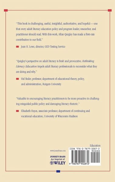 ?Quigley's perspective on adult literacy is fresh and provocative.Rethinking Literacy Education impels adult literacy professionalsto reconsider what they are doing and why.? (Hal Beder, professor,department of educational theory, policy, and administration,Rutgers)