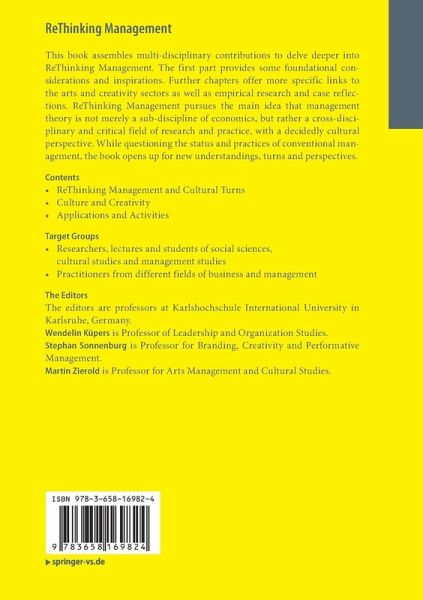 This book assembles multi-disciplinary contributions to delve deeper into ReThinking Management. The first part provides some foundational considerations and inspirations. Further chapters offer more specific links to the arts and creativity sectors as well as empirical research and case reflections. ReThinking Management pursues the main idea that management theory is not merely a sub-discipline of economics, but rather a cross-disciplinary and critical field of research and practice, with a decidedly cultural perspective. While questioning the status and practices of conventional management, the book opens up for new understandings, turns and perspectives.