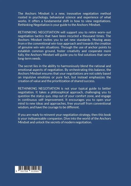 The Anchors Mindset is a new, innovative negotiation method rooted in psychology, behavioral science and experience of what works. It offers a fundamental shift in how to view negotiations. Rethinking Negotiation is your guide to the Anchors Mindset.RETHINKING NEGOTIATION will support you to retire worn-out negotiation tactics that have been recycled a thousand times. The Anchors Mindset invites you to set new standards. Moving away from e the conventional win-lose approach and towards the creation of genuine win-win situations. Through the use of anchor points to establish common ground, foster creativity and cooperate more fully, the Anchors Mindset will guide you to find solutions that serve long-term needs. The secret lies in the ability to harmoniously blend the rational and emotional aspects of negotiation. By orchestrating this balance, the Anchors Mindset ensures that your negotiations are not solely based on impulsive emotions or pure fact, but instead emphasizes the creation of value and the prioritization of shared success. RETHINKING NEGOTIATION is not your typical guide to better negotiation. It takes a philosophical approach, challenging you to question the status quo, step out of your comfort zone, and engage in continuous self-improvement. It encourages you to open your mind to new ideas and approaches, free yourself from conventional wisdom, and have the courage to be different. If you are ready to reinvent your negotiation strategy, then this book is your indispensable companion. Dive into the world of the Anchors Mindset and unlock the secrets of modern negotiation.