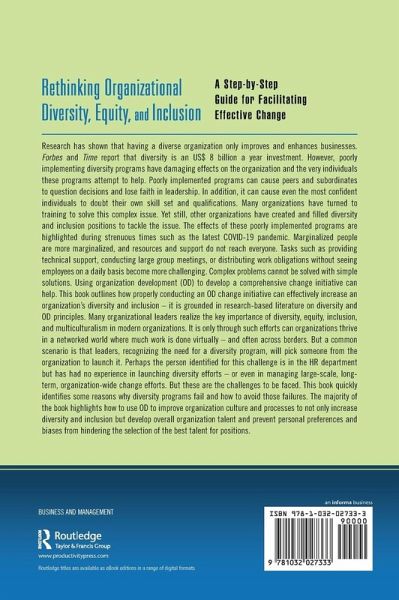 Research has shown that having a diverse organization only improves and enhances businesses. Forbes and Time report that diversity is an $8 Billion a year investment. However, poorly implementing diversity programs have damaging effects on the organization and the very individuals these programs attempt to help. Poorly implemented programs can cause peers and subordinates to question decisions and lose faith in leadership. In addition, it can cause even the most confident individuals to doubt their own skillset and qualifications. Many organizations have turned to training to solve this complex issue. Yet still, other organizations have created and filled diversity and inclusion positions to tackle the issue. The effects of these poorly implemented programs are highlighted during strenuous times such as the latest COVID-19 pandemic. Marginalized people are more marginalized, and resources and support do not reach everyone. Tasks such as providing technical support, conducting large group meetings, or distributing work obligations without seeing employees on a daily basis becomes more challenging. Complex problems cannot be solved with simple solutions. Using organization development (OD) to develop a comprehensive change initiative can help. This book outlines how properly conducting an OD change initiative can effectively increase an organization's diversity and inclusion -- it is grounded in research-based literature on diversity and OD principles. Many organizational leaders realize the key importance of diversity, equity, inclusion and multiculturalism in modern organizations. It is only through such efforts can organizations thrive in a networked world where much work is done virtually-and often across borders. But a common scenario is that leaders, recognizing the need for a diversity program, will pick someone from the organization to launch it. Perhaps the person identified for this challenge is in the HR department but has had no experience in launching diversity efforts-or even in managing large-scale, long-term, organization wide change efforts. But these are the challenges to be faced. This book quickly identifies some reasons why diversity programs fail and how to avoid those failures. The majority of the book highlights how to use OD to improve organization culture and processes to not only increase diversity and inclusion but develop overall organization talent and prevent personal preferences and biases from hindering the selection of the best talent for positions.