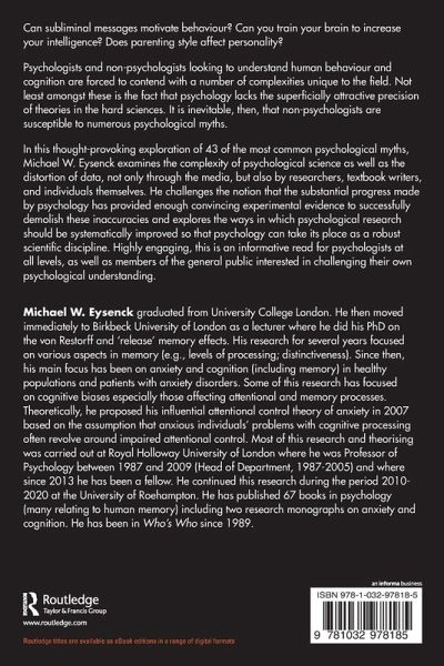 In this thought-provoking exploration of 43 of the most common psychological myths, Michael W. Eysenck examines the complexity of psychological science as well as the distortion of data, not only through the media, but also by researchers, textbook writers, and individuals themselves. He challenges the notion that the substantial progress made by psychology has provided enough convincing experimental evidence to successfully demolish these inaccuracies and explores the ways in which psychological research should be systematically improved so that psychology can take its place as a robust scientific discipline. Highly engaging, this is an informative read for psychologists at all levels, as well as members of the general public interested in challenging their own psychological understanding.