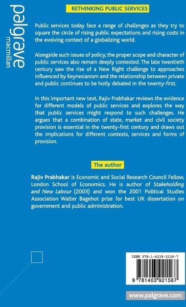 In this important new text, Rajiv Prabhakar reviews the evidence for different models of public services arguing that a combination of state, market and civil society provision is essential in the twenty-first century and drawing out the implications for different contexts, services and forms of provision.