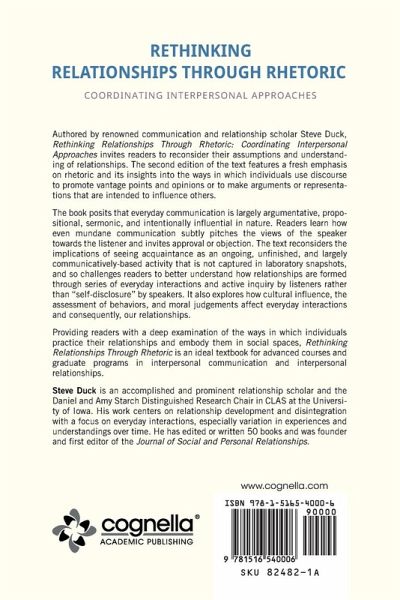 Authored by renowned communication and relationship scholar Steve Duck, Rethinking Relationships Through Rhetoric: Coordinating Interpersonal Approaches invites readers to reconsider their assumptions and understanding of relationships. The second edition of the text features a fresh emphasis on rhetoric and its insights into the ways in which individuals use discourse to promote vantage points and opinions or to make arguments or representations that are intended to influence others. The book posits that everyday communication is largely argumentative, propositional, sermonic, and intentionally influential in nature. Readers learn how even mundane communication subtly pitches the views of the speaker towards the listener and invites approval or objection. The text reconsiders the implications of seeing acquaintance as an ongoing, unfinished, and largely communicatively-based activity that is not captured in laboratory snapshots, and so challenges readers to better understand how relationships are formed through series of everyday interactions and active inquiry by listeners rather than "self-disclosure" by speakers. It also explores how cultural influence, the assessment of behaviors, and moral judgements affect everyday interactions and consequently, our relationships. Providing readers with a deep examination of the ways in which individuals practice their relationships and embody them in social spaces, Rethinking Relationships Through Rhetoric is an ideal textbook for advanced courses and graduate programs in interpersonal communication and interpersonal relationships.