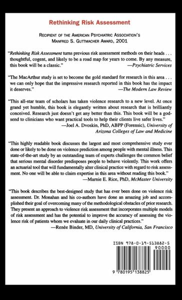 The presumed link between mental disorder and violence has been the driving force behind mental health law and policy for centuries. Legislatures, courts, and the public have come to expect that mental health professionals will protect them from violent acts by persons with mental disorders. Yet for three decades research has shown that clinicians' unaided assessments of "dangerousness" are barely better than chance. Rethinking Risk Assessment: The MacArthur Study of Mental Disorder and Violence tells the story of a pioneering investigation that challenges preconceptions about the frequency and nature of violence among persons with mental disorders, and suggests an innovative approach to predicting its occurrence. The authors of this massive project -- the largest ever undertaken on the topic -- demonstrate how clinicians can use a "decision tree" to identify groups of patients at very low and very high risk for violence. This dramatic new finding, and its implications for the every day clinical practice of risk assessment and risk management, is thoroughly described in this remarkable and long-anticipated volume. Taken to heart, its message will change the way clinicians, judges, and others who must deal with persons who are mentally ill and may be violent will do their work.