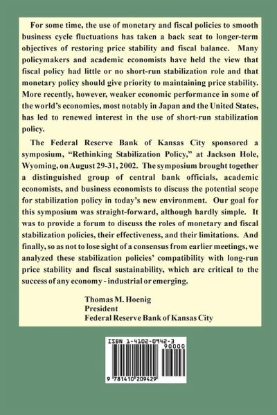 For some time, the use of monetary and fiscal policies to smooth business cycle fluctuations has taken a back seat to longer-term objectives of restoring price stability and fiscal balance. Many policymakers and academic economists have held the view that fiscal policy had little or no short-run stabilization role and that monetary policy should give priority to maintaining price stability. More recently, however, weaker economic performance in some of the world's economies, most notably in Japan and the United States, has led to renewed interest in the use of short-run stabilization policy. The Federal Reserve Bank of Kansas City sponsored a symposium, "Rethinking Stabilization Policy," at Jackson Hole, Wyoming, on August 29-31, 2002. The symposium brought together a distinguished group of central bank officials, academic economists, and business economists to discuss the potential scope for stabilization policy in today's new environment. Our goal for this symposium was straight-forward, although hardly simple. It was to provide a forum to discuss the roles of monetary and fiscal stabilization policies, their effectiveness, and their limitations. And finally, so as not to lose sight of a consensus from earlier meetings, we analyzed these stabilization policies' compatibility with long-run price stability and fiscal sustainability, which are critical to the success of any economy - industrial or emerging. Thomas M. Hoenig President Federal Reserve Bank of Kansas City
