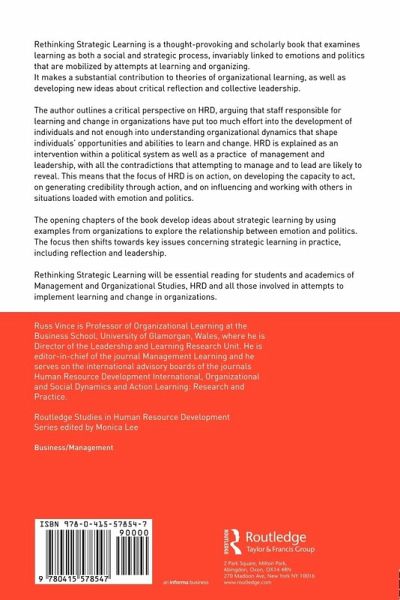 Russ Vince examines learning as both a social and a strategic process, invariably linked to emotions and politics that are mobilized by attempts at learning and organizing. He makes a substantial contribution to theories of organizational learning and develops new ideas about critical reflection and collective leadership. The author outlines a critical perspective on HRD, arguing that staff responsible for learning and change in organizations have put too much effort into the development of individuals and not enough into understanding and engaging with organizational dynamics that limit and shape individuals' opportunities and abilities to learn and change. HRD is explained as an intervention within a political system and practice of management and leadership, with all the difficulties and contradictions that attempting to manage and to lead are likely to contain and reveal. This means that the focus of HRD is on action, on developing the capacity to act, on generating credibility through action, and on influencing and working with others in situations loaded with emotion and politics.
