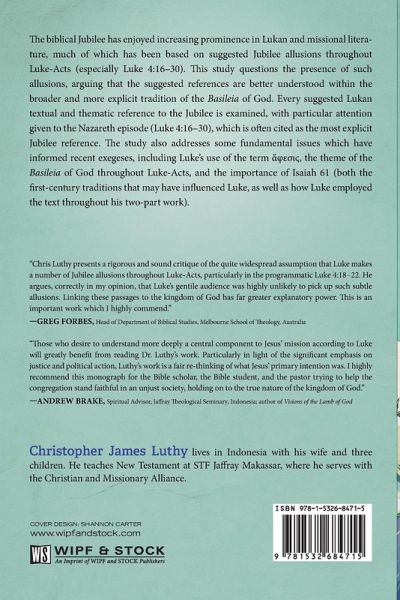 The biblical Jubilee has enjoyed increasing prominence in Lukan and missional literature, much of which has been based on suggested Jubilee allusions throughout Luke-Acts (especially Luke 4:16-30). This study questions the presence of such allusions, arguing that the suggested references are better understood within the broader and more explicit tradition of the Basileia of God. Every suggested Lukan textual and thematic reference to the Jubilee is examined, with particular attention given to the Nazareth episode (Luke 4:16-30), which is often cited as the most explicit Jubilee reference. The study also addresses some fundamental issues which have informed recent exegeses, including Luke's use of the term ¿¿¿¿¿¿, the theme of the Basileia of God throughout Luke-Acts, and the importance of Isaiah 61 (both the first-century traditions that may have influenced Luke, as well as how Luke employed the text throughout his two-part work).