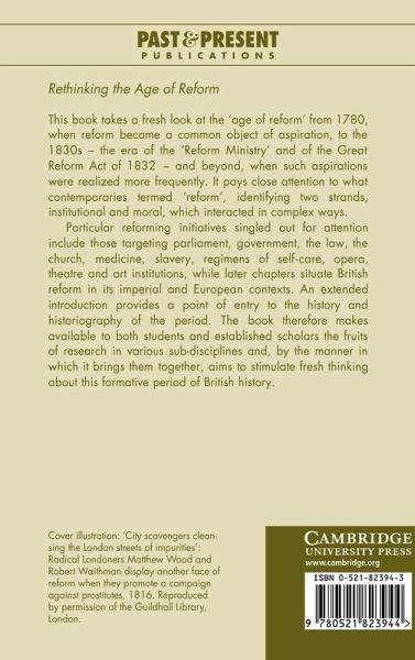 This book takes a fresh look at the 'age of reform', from 1780 when reform became a common object of aspiration, to the 1830s - the era of the 'Reform Ministry' and of the Great Reform Act of 1832 - and beyond, when such aspirations were realised more frequently. It pays close attention to what contemporaries termed 'reform', identifying two strands, institutional and moral, which interacted in complex ways. Particular reforming initiatives singled out for attention include those targeting parliament, government, the law, the church, medicine, slavery, regimens of self-care, opera, theatre, and art institutions, while later chapters situate British reform in its imperial and European contexts. An extended introduction provides a point of entry to the history and historiography of the period. The book will therefore stimulate fresh thinking about this formative period of British history.