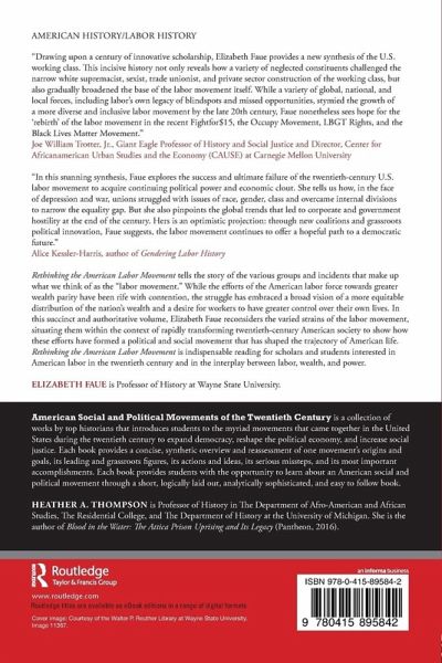 Rethinking the American Labor Movement tells the story of the various groups and incidents that make up what we think of as the "labor movement." While the efforts of the American labor force towards greater wealth parity have been rife with contention, the struggle has embraced a broad vision of a more equitable distribution of the nation's wealth and a desire for workers to have greater control over their own lives. In this succinct and authoritative volume, Elizabeth Faue reconsiders the varied strains of the labor movement, situating them within the context of rapidly transforming twentieth-century American society to show how these efforts have formed a political and social movement that has shaped the trajectory of American life. Rethinking the American Labor Movement is indispensable reading for scholars and students interested in American labor in the twentieth century and in the interplay between labor, wealth, and power.
