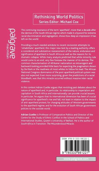 Preface Introduction: Apartheid's Global Significance The Debate on the Nature of South Africa's Racial Policies: Totalitarian or Colonial? Origins of Racial Policy: Consequence of an Imperialist War or the Prejudice of the Frontier? Segregation: Home-grown or Imported? The Theory and Practice of Apartheid: Was There a Blueprint? South Africa in a Post-Colonial World: Modernising or Eroding Apartheid? From Vorster to Botha: New Departure or Militarised Cul de Sac? The Pursuit of a Negotiated Settlement: Choice or Necessity? The Unexpected Transition to Majority Rule: Analysing a Miracle? The Worldwide Anti-Apartheid Movement: Peripheral or Crucial? Conclusion: Taking the Long View on Apartheid's Demise.