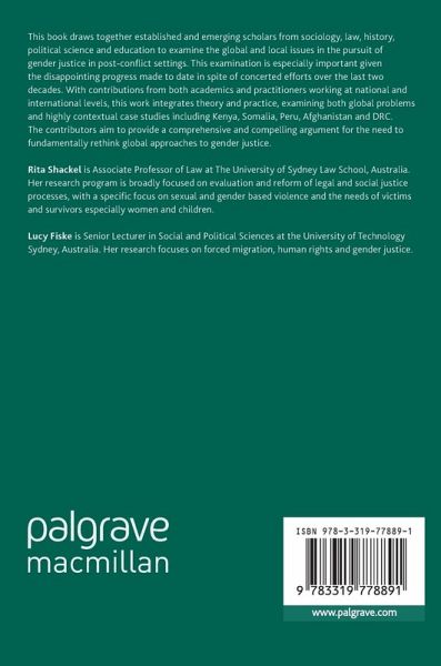 This book draws together established and emerging scholars from sociology, law, history, political science and education to examine the global and local issues in the pursuit of gender justice in post-conflict settings. This examination is especially important given the disappointing progress made to date in spite of concerted efforts over the last two decades. With contributions from both academics and practitioners working at national and international levels, this work integrates theory and practice, examining both global problems and highly contextual case studies including Kenya, Somalia, Peru, Afghanistan and DRC. The contributors aim to provide a comprehensive and compelling argument for the need to fundamentally rethink global approaches to gender justice.