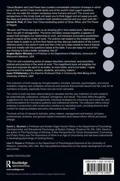 "In Rethinking Work: Essays on Building a Better Workplace, Blustein and Flores provide the perfect venue to reflect on the interrelated factors impacting the current state of work, while simultaneously providing a space to begin reimagining a world of work that is more just, equitable, and fulfilling for all. Indeed, the innovation strategies, ideas, models, and tools delineated in this volume offer a starting point for transforming a system that has created differential classes of workers-those who work for survival and those who work for self-determination-to a system that lifts up ALL workers as they survive and thrive in healthier workspaces. There is no doubt that this volume of work will guide future research, training, organizational structures, management strategies, and public policy that will transform the world of work for the better."