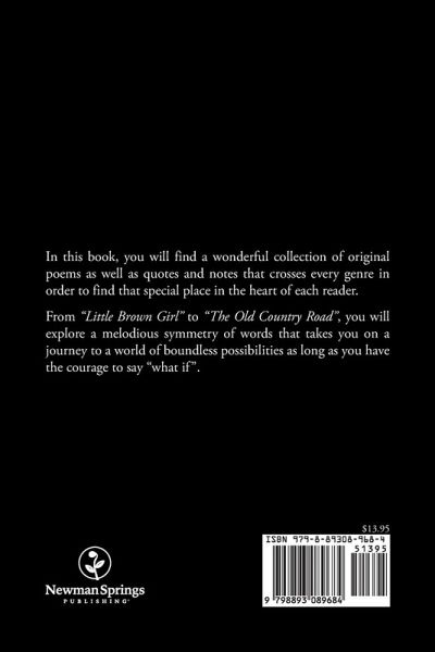 In this book, you will find a wonderful collection of original poems as well as quotes and notes that crosses every genre in order to find that special place in the heart of each reader. From "Little Brown Girl" to "The Old Country Road," you will explore a melodious symmetry of words that takes you on a journey to a world of boundless possibilities as long as you have the courage to say "what if."