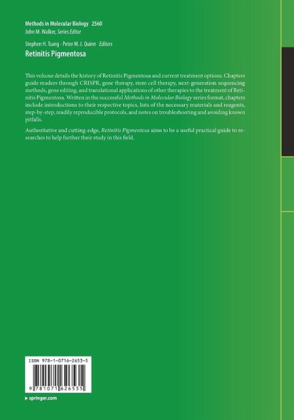 Introduction and History of Retinitis Pigmentosa.- Etiology of Retinitis Pigmentosa.- Clinical Evaluation of Patients with Retinitis Pigmentosa.- Molecular Genetic Testing Approaches for Retinitis Pigmentosa.- Pedigree Analysis of Families and Patients Affected by Retinitis Pigmentosa.- Whole Genome Sequencing for Detection of Structural Variants in Patients with Retinitis Pigmentosa.- Fundus Imaging Methodologies to Assess RP patients.- The Use of Optical Coherence Tomography in Evaluation of Retinitis Pigmentosa.- Optical Coherence Tomography Angiography (OCTA) findings in Retinitis Pigmentosa.- ERG to Evaluate the Retina in Cases of Retinitis Pigmentosa.- Visual Function Tests: Visual Fields.- Visual Function Tests.- Visual Acuity as a Measurement of Visual Function.- Measure of Visual Function.- Ophthalmic Fluorescein Angiography.- Indocyanine Green Angiography.- Use of the Medmont Dark-Adapted Chromatic Perimeter for Assessing Rod Function in Retinitis Pigmentosa.- Multi-Luminance Mobility Testing Endpoint.- Preclinical Models of Retinitis Pigmentosa.- ERG to evaluate the retina using mouse models.- Autofluorescence Imaging to Evaluate Retinal Disease Progression in Rodent.- Large animal models of retinitis pigmentosa in therapy development and preclinical testing.- CRISPR manipulations in stem cell lines.- CRISPR-mediated genome engineering in cell lines.- CRISPR off-targeting.- CRISPR manipulations in stem cell lines.- Generation of Human iPSC-Derived Retinal Organoids for Assessment of AAV-Mediated Gene Delivery.- Culture of Human Retinal Explants for Ex Vivo Assessment of AAV Gene Delivery.- Prime Editing for the Installation and Correction of Mutations causing Inherited Retinal Disease: A Brief Methodology.- Large scale single-nucleus RNA sequencing compatible with complex archived samples.- Vector Shedding and Immunogenicity Sampling in AAV-based Gene Therapy for Retinitis Pigmentosa Patients.- Current Management Options for Patients with Retinitis Pigmentosa.- Challenges of Treatment Methodologies and the Future of Gene Therapy and Stem Cell Therapy to Treat Retinitis Pigmentosa.- Ocular Injection Techniques for Retinitis Pigmentosa: Intravitreal, Subretinal, and Suprachoroidal.- Surgical Approach with Pars Plana Vitrectomy for Subretinal Gene Therapy.