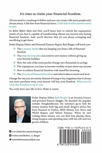 "Clear, accurate, insightful. This might be the best introduction to financial freedom I've ever found." -J.D. Roth, author and founder of GetRichSlowly.org. Personal finance and investing don't have to be complicated, intimidating or boring. Imagine having a guide to walk you through everything you need to chart a path to financial freedom. Forbes Deputy Editor Rob Berger has written your guide. Find everything you need to get out of debt, control spending without painful budgets, manage multiple financial goals, and start investing for retirement. And yes, you'll even learn how to retire early if FIRE (Financial Independence, Retire Early) is your goal. Here are just a few of the topics covered: The Money Audit: Learn how to save money without sacrifice. This step-by-step plan walks you through how to reduce your spending without changing your lifestyle. FIRE Math: You'll master the simple math behind early retirement. You'll also be able to determine how your daily, weekly and monthly decisions affect your journey to financial independence. Simple Investing: The days of being intimidated by mutual funds or the stock market are over. This book provides everything you need to build a simple investment portfolio that you can actually understand. Retirement Accounts: From 401(k) and 403(b) accounts to a Roth IRA and HSA (Health Spending Account), you'll learn how these accounts work. You'll also get a simple plan you can follow to decide which accounts are best for you. Get Out of Debt: Debt doesn't have to hold you back from your financial goals. The book walks through a simple way to pay off your debt in a sensible way while still saving, investing, and pursuing other financial goals. Life Experiments: Learn how your daily habits are affecting your finances and how you can master those habits by asking "what if" questions and running 21-day experiments. The book is designed for anybody wanting to master their money, but is tired of all the complicated jargon. Readers are already enjoying Retire Before Mom and Dad: "I thoroughly enjoyed this book and will go back and re-read, study & refer to many of its sections. The author writes in plain English and provides some really smart advice about our money and some really cool suggestions & referrals." Wesley, Goodreads Review. "Probably one of the most straight forward and easiest to understand personal finance books with simple next action items to set yourself up for success on your journey towards financial freedom." Jeffrey Diritto, Goodreads Review.