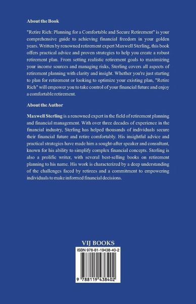 "Retire Rich: Planning for a Comfortable and Secure Retirement" is your comprehensive guide to achieving financial freedom in your golden years. Written by renowned retirement expert Maxwell Sterling, this book offers practical advice and proven strategies to help you create a robust retirement plan. From setting realistic retirement goals to maximizing your income sources and managing risks, Sterling covers all aspects of retirement planning with clarity and insight. Whether you're just starting to plan for retirement or looking to optimize your existing plan, "Retire Rich" will empower you to take control of your financial future and enjoy a comfortable retirement.