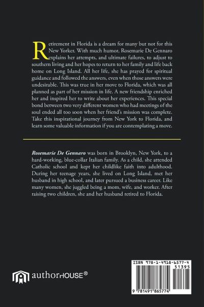 Retirement in Florida is a dream for many but not for this New Yorker. With much humor, Rosemarie De Gennaro explains her attempts, and ultimate failures, to adjust to southern living and her hopes to return to her family and life back home on Long Island. All her life, she has prayed for spiritual guidance and followed the answers, even when those answers were undesirable. This was true in her move to Florida, which was all planned as part of her mission in life. A new friendship enriched her and inspired her to write about her experiences. This special bond between two very different women who had meetings of the soul ended all too soon when her friend's mission was complete. Take this inspirational journey from New York to Florida, and learn some valuable information if you are contemplating a move.