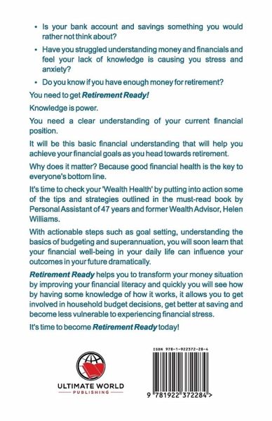 Is your bank account and savings something you would rather not think about? Have you struggled understanding money and financials and feel your lack of knowledge is causing you stress and anxiety? Do you know if you have enough money for retirement? You need to get Retirement Ready! Knowledge is power. You need a clear understanding of your current financial position. It will be this basic financial understanding that will help you achieve your financial goals as you head towards retirement. Why does it matter? Because good financial health is the key to everyone's bottom line. It's time to check your 'Wealth Health' by putting into action some of the tips and strategies outlined in the must-read book by Personal Assistant of 47 years and former Wealth Advisor, Helen Williams. With actionable steps such as goal setting, understanding the basics of budgeting and superannuation, you will soon learn that your financial well-being in your daily life can influence your outcomes in your future dramatically. Retirement Ready helps you to transform your money situation by improving your financial literacy and quickly you will see how by having some knowledge of how it works, it allows you to get involved in household budget decisions, get better at saving and become less vulnerable to experiencing financial stress. It's time to become Retirement Ready today!