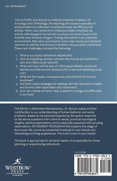 THE BOOK: In Retirement Reorientation, Dr. Bynum makes another contribution to our understanding of human behavior and social problems. Based on his personal experience, the author responds to the above questions with common sense, practical sociological insights, spiritual applications, and occasionally seasoned with amusing observations. RETIREMENT REORIENTATION explains this stage of the human life course as a potential threshold to new friends and interesting enriching experiences. The book is now in your hands! This book is appropriate for all adult readers, but especially for those planning or experiencing retirement.
