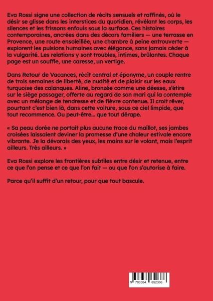 Eva Rossi signe une collection de récits sensuels et raffinés, où le désir se glisse dans les interstices du quotidien, révélant les corps, les silences et les frissons enfouis sous la surface. Ces histoires contemporaines, ancrées dans des décors familiers - une terrasse en Provence, une route ensoleillée, une chambre à peine entrouverte - explorent les pulsions humaines avec élégance, sans jamais céder à la vulgarité. Les relations y sont troubles, intimes, brûlantes. Chaque page est un souffle, une caresse, un vertige.Dans Retour de Vacances, récit central et éponyme, un couple rentre de trois semaines de liberté, de nudité et de plaisir sur les eaux turquoise des calanques. Aline, bronzée comme une déesse, s'étire sur le siège passager, offerte au regard de son mari qui la contemple avec un mélange de tendresse et de fièvre contenue. Il croit rêver, pourtant c'est bien là, dans cette voiture, sous ce ciel limpide, que tout recommence. Ou peut-être... que tout dérape.« Sa peaudorée ne portait plus aucune trace du maillot, ses jambes croisées laissaient deviner la promesse d'une chaleur estivale encore vibrante. Je la dévorais des yeux, les mains sur le volant, mais l'esprit ailleurs. Très ailleurs. »Eva Rossi explore les frontières subtiles entre désir et retenue, entre ce que l'on pense et ce que l'on fait - ou que l'on s'autorise à faire.Parce qu'il suffit d'un retour, pour que tout bascule.