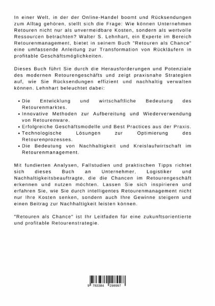 n einer Welt, in der der Online-Handel boomt und Rücksendungen zum Alltag gehören, stellt sich die Frage: Wie können Unternehmen Retouren nicht nur als unvermeidbare Kosten, sondern als wertvolle Ressourcen betrachten? Walter S. Lehnhart, ein Experte im Bereich Retourenmanagement, bietet in seinem Buch "Retouren als Chance" eine umfassende Anleitung zur Transformation von Rückläufern in profitable Geschäftsmöglichkeiten.Dieses Buch führt Sie durch die Herausforderungen und Potenziale des modernen Retourengeschäfts und zeigt praxisnahe Strategien auf, wie Sie Rücksendungen effizient und nachhaltig verwalten können. Lehnhart beleuchtet dabei:Die Entwicklung und wirtschaftliche Bedeutung des Retourenmarktes.Innovative Methoden zur Aufbereitung und Wiederverwendung von Retourenware.Erfolgreiche Geschäftsmodelle und Best Practices aus der Praxis.Technologische Lösungen zur Optimierung des Retourenprozesses.Die Bedeutung von Nachhaltigkeit und Kreislaufwirtschaft im Retourenmanagement.Mit fundierten Analysen, Fallstudien und praktischen Tipps richtet sich dieses Buch an Unternehmer, Logistiker und Nachhaltigkeitsbeauftragte, die die Chancen im Retourengeschäft erkennen und nutzen möchten. Lassen Sie sich inspirieren und erfahren Sie, wie Sie durch intelligentes Retourenmanagement nicht nur Ihre Kosten senken, sondern auch Ihre Gewinne steigern und einen Beitrag zur Nachhaltigkeit leisten können."Retouren als Chance" ist Ihr Leitfaden für eine zukunftsorientierte und profitable Retourenstrategie.