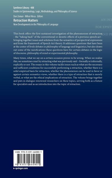 Many times, what we say on a certain occasion proves to be wrong. When we realize this, we sometimes react by retracting what was previously said - formally or informally, explicitly or not. The essays in this volume tackle issues such as what are the necessary and sufficient conditions for successfully performing a retraction, whether there is a solid empirical basis for retraction, whether the phenomenon can be used in favor or against certain semantics views, whether there is a type of retraction that is merely verbal, or what are the ethical implications of retraction. The volume brings together and puts in dialogue renowned researchers on these topics, serving both as a fixture for specialists and as an introduction into the topic of retraction.