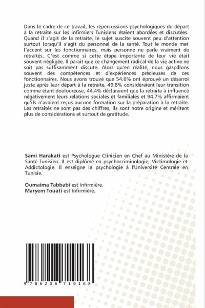 Dans le cadre de ce travail, les répercussions psychologiques du départ à la retraite sur les infirmiers Tunisiens étaient abordées et discutées. Quand il s'agit de la retraite, le sujet suscite souvent peu d'attention surtout lorsqu'il s'agit du personnel de la santé. Tout le monde met l'accent sur les fonctionnaires, mais personne ne parle vraiment de retraités. C'est comme si cette étape importante de leur vie était souvent négligée. Il parait que ce changement radical de la vie active ne soit pas suffisamment discuté. Alors qu'en réalité, nous gaspillons souvent des compétences et d'expériences précieuses de ces fonctionnaires. Nous avons trouvé que 54.6% ont éprouvé un désarroi juste après leur départ à la retraite, 49.8% considéraient leur transition comme étant douloureuse, 44.4% déclaraient que la retraite à influencé négativement leurs relations sociales et familiales et 94.7% affirmaient qu'ils n'avaient reçus aucune formation sur la préparation à la retraite. Les retraités ne sont pas des chiffres, ils sont notre origine et méritent plus de considérations et surtout de gratitude.