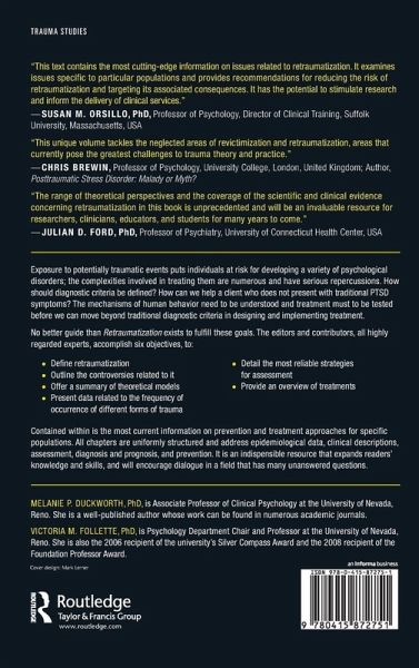 Follette Duckworth Introduction to the Assessment Treatment and Prevention of Retraumatization. Zayfert Cognitive Behavioral Conceptualization of Retraumatization. Kudler A Psychodynamic Conceptualization of Retraumatization. King Liberzon Neurobiology of Retraumatization. Schumn Doane Hobfoll Conservation of Resources Theory: The Central Role of Resource Loss and Gain in Understanding Retraumatization. Bonow Follette A Functional Analytic Conceptualization of Retraumatization: Implications for Clinical Assessment. Courtois Retraumatization and Complex Traumatic Stress: A Treatment Overview. Alexander Retraumatization and Revictimization: An Attachment Perspective. Kuhn Hoffman Ruzek Multiple Experiences of Combat Trauma. Iverson Monson Street Dual Combat and Sexual Trauma During Military Service. Papa La Bush Multiple Traumas in Civilian Casualties of Organized Political Violence. Ghimire Follette Revictimization: Experiences Related to Child Adolescent and Adult Sexual Trauma. Fruzzetti Lee Multiple Experiences of Domestic Violence and Associated Relationship Features. Duckworth Iezzi Shearer Retraumatization Associated with Disabling Physical Injuries. Batten Naifeh Controversies Related to the Study and Treatment of Multiple Experiences of Trauma. Duckworth Follette Conclusions and Future Directions in Assessment Treatment and Prevention of Retraumatization.