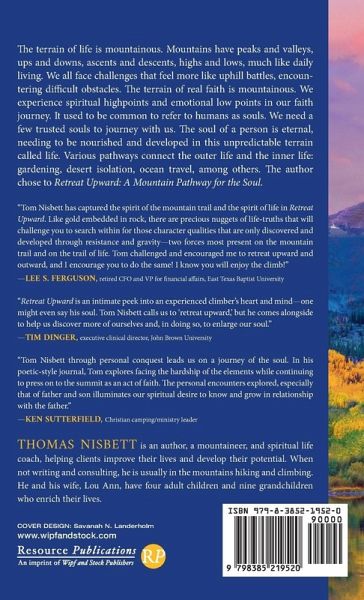 The terrain of life is mountainous. Mountains have peaks and valleys, ups and downs, ascents and descents, highs and lows, much like daily living. We all face challenges that feel more like uphill battles, encountering difficult obstacles. The terrain of real faith is mountainous. We experience spiritual highpoints and emotional low points in our faith journey. It used to be common to refer to humans as souls. We need a few trusted souls to journey with us. The soul of a person is eternal, needing to be nourished and developed in this unpredictable terrain called life. Various pathways connect the outer life and the inner life: gardening, desert isolation, ocean travel, among others. The author chose to Retreat Upward: A Mountain Pathway for the Soul.