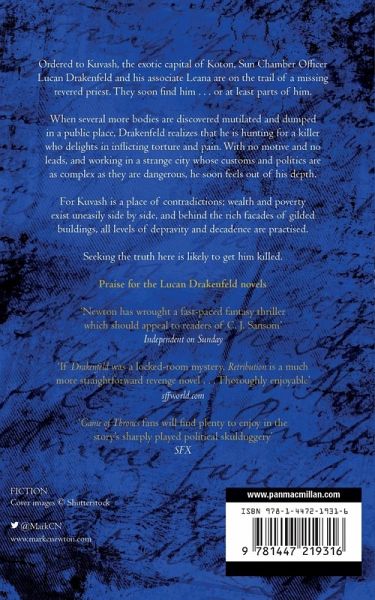 Inspired by the classical ancient world and authors such as C J Sansom, Retribution is the second Drakenfeld novel, in Mark Charan Newton's thrilling fantasy crime series. When justice fails, revenge follows . . . Having just solved a difficult case in his home city of Tryum, Sun Chamber Officer Lucan Drakenfeld and his associate Leana are ordered to journey to the exotic city of Kuvash in Koton, where a revered priest has gone missing. When they arrive, they discover the priest has already been found - or at least parts of him have. But investigating the unusual death isn't a priority for the legislature of Kuvash; there's a kingdom to run, a census to create and a dictatorial Queen to placate. Soon Drakenfeld finds that he is suddenly in charge of an investigation in a strange city, whose customs and politics are as complex as they are dangerous. Kuvash is a city of contradictions; wealth and poverty exist uneasily side-by-side and behind the rich façades of gilded streets and buildings, all levels of depravity and decadence are practised. When several more bodies are discovered mutilated and dumped in a public place, Drakenfeld realizes there's a killer at work who seems to delight in torture and pain. With no motive, no leads and no suspects, he feels like he's running out of options. And in a city where nothing is as it seems, seeking the truth is likely to get him killed . . .