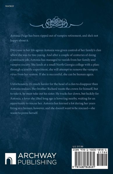 Antonia Paige has been ripped out of vampire retirement, and she’s not happy about it. Everyone in her life agrees Antonia was given control of her family’s clan when she was far too young. And after a couple of centuries of doing a mediocre job, Antonia has managed to vanish from her family and vampire society. She lands at a small North Georgia college with a plan: through scientific experiment, she will attempt to remove the vampire virus from her system. If she is successful, she can be human again. Unfortunately, it’s much harder for the head of a clan to disappear than Antonia realizes. Her brother Richard wants the crown for himself, but to take it, he must take out his sister. He tracks her down, but luckily for Antonia, a lover she jilted long ago is hovering nearby, waiting for an opportunity to rescue her. Antonia has learned a lot during her years living as a human, however, and she doesn’t want to be rescued—she wants to prove herself.