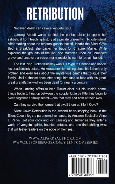 Not even death can calm a vengeful soul. Lansing Abbott wants to find the perfect place to spend her sabbatical from teaching history at a private university in Rhode Island. After reading about the ethereal guests that still inhabit the Silent Cove Bed & Breakfast, she packs her bags for Chistine, Maine. While exploring the grounds of the inn, she stumbles upon an unmarked grave, and uncovers a secret many residents want to remain buried. The last thing Tucker Kingsley wants is to go to Chistine and handle his dead uncle’s estate. He knows next to nothing about his father’s only brother, and even less about the mysterious deaths that plague their family. Until a chance encounter brings him face-to-face with his great, great grandfather—who’s been dead for nearly a century. When Lansing offers to help Tucker clear out his uncle’s home, things begin to heat up between the couple. Little by little they begin to piece together a family secret—one that may end both of their lives. Can they survive the horrors that await them at Silent Cove? Silent Cove: Retribution is the second heart-stopping book in the Silent Cove trilogy, a paranormal romance, by Amazon Bestseller Anne L. Parks. Get your copy and join Lansing and Tucker as they enter a world of vengeful spirits, haunted estates, and one final chilling twist that will leave readers on the edge of their seat.