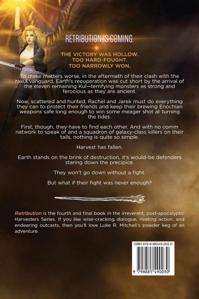 THE VICTORY WAS HOLLOW. Too hard-fought. Too short-lived. Now, scattered and hunted by the monstrous rakul, Rachel and Jarek must do everything they can to protect their friends and keep their brewing Enochian weapons safe long enough for one slim chance at turning the tides. But first, they have to find each other. And with no comm network to speak of and a squadron of galaxy-class killers on their tails, nothing is quite so simple. Harvest has fallen. Earth stands on the brink of destruction, it's would-be defenders staring down the precipice. They won't go down without a fight. But what if their fight was never enough? Grab your copy of Retribution now, and suit up for the thrilling conclusion of The Harvesters Series!