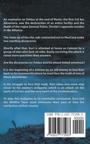 An explosion on Toldax at the end of Ronin, the first Col Sec adventure, saw the destruction of an entire facility and the death of the rogue General Solon, Sinclair's opposite number in the Alliance. The clean-up of the site, sub-contracted out to MaxCorp make two startling discoveries. Shortly after that, Kurt is attacked at home on Celeron by a group of men who look all alike. Easily surviving the attack it raises more questions than answers. Are the discoveries on Toldax and his attack linked somehow? It is the beginning of a scheme by an old enemy to lure Kurt back to his homeworld where he must face the truth of one of those discoveries. In his struggle to face that truth, Kurt takes one more step closer to his enemy's endgame, which is an attack on the teeth of Col Sec and the very heart of the Confederation. To play this endgame to its inevitable conclusion, Kurt and the Wildfire Team must overcome their past or face the retribution of their enemy.