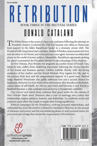 The White House is the scene of chaos and confusion following the attempt on President Andrew Cochran's life. Old foes become new allies as Democrats lend support to the fallen Republican leader in a dramatic power shift. The President's life-long friend and confidant, Nathan Whitaker, demonstrates his love and devotion to his friend, and in the process, once again, becomes an influential player in the world of power politics. Meanwhile, Republican opponents seeking the party's nomination for President attempt to take advantage of the situation. In New Orleans, Posy Branch, the magnetic successful owner of French Tips, Juleps & Jazz, suffers from stultifying depression following the vicious murder of her friend and business partner, Chiffon LaBelle. Slowly, with the loving assistance of her mother and her friend Michael, Posy regains her life, and in the process finds love and the unquestioned support of a good man. Retired Judge Stanford Winchester also gladly embraces love and a second chance for happiness. However, his lack of direction and purpose after decades on the bench, causes issues of self-worth. An old foe intervenes and becomes a new friend as Stanford becomes a vital confidant and advisor to a Presidential candidate. Clay Grover and Aaron Rose continue their good works for the citizens of New Orleans Ninth ward. However, after a year of marriage, they realize that relationships require patience, honesty, and dedication. An explosive secret and common cause allow the couple to regain their loving equilibrium. Political campaigns for the Presidency, evolving personal relationships, and outlandish lies move the novel to a climactic conclusion. However, it's the pursuit of influence and power, and the overwhelming desire to seek personal justice for perceived past wrongs that entreat the requirement of RETRIBUTION.