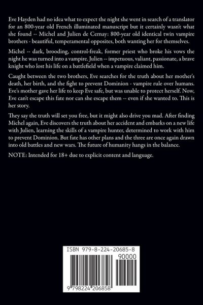 Eve Hayden had no idea what to expect the night she went in search of a translator for an 800-year old French illuminated manuscript but it certainly wasn't what she found -- Michel and Julien de Cernay: 800-year old identical twin vampire brothers - beautiful, temperamental opposites, both wanting her for themselves. Michel -- dark, brooding, control-freak, former priest who broke his vows the night he was turned into a vampire. Julien -- impetuous, valiant, passionate, a brave knight who lost his life on a battlefield when a vampire claimed him. Caught between the two brothers, Eve searches for the truth about her mother's death, her birth, and the fight to prevent Dominion - vampire rule over humans. Eve's mother gave her life to keep Eve safe, but was unable to protect herself. Now, Eve can't escape this fate nor can she escape them -- even if she wanted to. This is her story. They say the truth will set you free, but it might also drive you mad. After finding Michel again, Eve discovers the truth about her accident and embarks on a new life with Julien, learning the skills of a vampire hunter, determined to work with him to prevent Dominion. But fate has other plans and the three are once again drawn into old battles and new wars. The future of humanity hangs in the balance. NOTE: Intended for 18+ due to explicit content and language.
