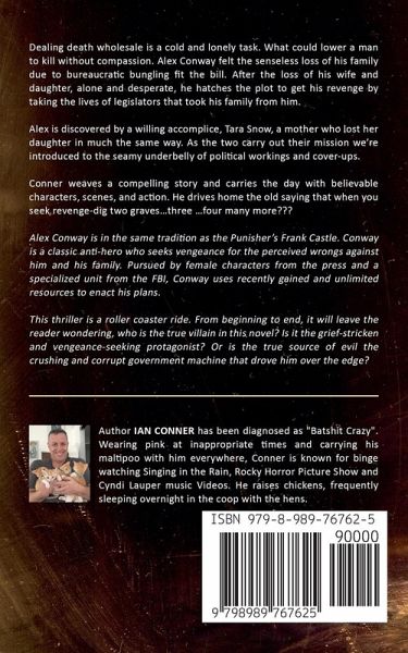 Dealing death wholesale is a cold and lonely task. What could lower a man to kill without compassion. Alex Conway felt the senseless loss of his family due to bureaucratic bungling fit the bill. After the loss of his wife and daughter, alone and desperate, he hatches the plot to get his revenge by taking the lives of legislators that took his family from him. Alex is discovered by a willing accomplice, Tara Snow, a mother who lost her daughter in much the same way. As the two carry out their mission we're introduced to the seamy underbelly of political workings and cover-ups. Conner weaves a compelling story and carries the day with believable characters, scenes, and action. He drives home the old saying that when you seek revenge-dig two graves...three ...four many more??? Alex Conway is in the same tradition as the Punisher's Frank Castle. Conway is a classic anti-hero who seeks vengeance for the perceived wrongs against him and his family. Pursued by female characters from the press and a specialized unit from the FBI, Conway uses recently gained and unlimited resources to enact his plans. This l thriller is a roller coaster ride. From beginning to end, it will leave the reader wondering, who is the true villain in this novel? Is it the grief-stricken and vengeance-seeking protagonist? Or is the true source of evil the crushing and corrupt government machine that drove him over the edge?