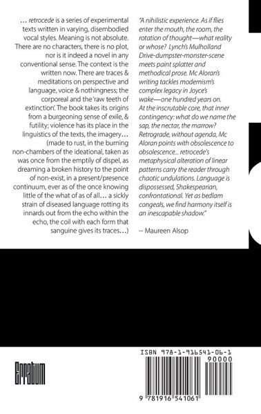 ... retrocede is a series of experimental texts written in varying, disembodied vocal styles. Meaning is not absolute. There are no characters, there is no plot, nor is it indeed a novel in any conventional sense. The context is the written now. There are traces & meditations on perspective and language, voice & nothingness; the corporeal and the 'raw teeth of extinction'. The book takes its origins from a burgeoning sense of exile, & futility; violence has its place in the linguistics of the texts, the imagery... (made to rust, in the burning non-chambers of the ideational, taken as was once from the emptily of dispel, as dreaming a broken history to the point of non-exist, in a present/presence continuum, ever as of the once knowing little of the what of as of all... a sickly strain of diseased language rotting its innards out from the echo within the echo, the coil with each form that sanguine gives its traces...) /// "A nihilistic experience. As if flies enter the mouth, the room, the rotation of thought-what reality or whose? Lynch's Mulholland Drive -dumpster-monster-scene meets paint splatter and methodical prose. Mc Aloran's writing tackles modernism's complex legacy in Joyce's wake-one hundred years on. At the inscrutable core, that inner contingency: what do we name the sap, the nectar, the marrow? Retrograde, without agenda, Mc Aloran points with obsolescence to obsolescence... retrocede's metaphysical alteration of linear patterns carry the reader through chaotic undulations. Language is dispossessed, Shakespearian, confrontational. Yet as bedlam congeals, we find harmony itself is an inescapable shadow." -- Maureen Alsop