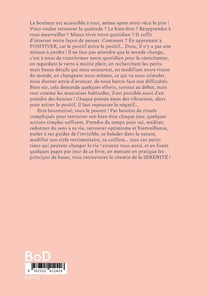Ce livre repose sur des histoires de clients, de connaissances, mais surtout sur des expériences personnelles vécues par l'auteure. Épreuves intenses, mais aussi triomphes face à l'adversité, et moments de calme retrouvés... Ceci, pour vous démontrer que, malgré les assauts que la vie nous inflige parfois, le bonheur peut réapparaître, même après avoir enduré le pire ! Vous avez la possibilité de retrouver la sérénité et de vivre de grands bonheurs malgré les aléas de la vie.De quelle façon ?Au chapitre I, vous serez éclairé.e sur :- « le pourquoi », certains sont plus éprouvés que d'autres ; et si c'était le karma ? Alors comment le modifier.chapitre II : comment transformer son existence, améliorer le quotidien, et être heureux.se malgré les épreuves ! Atteindre le bien-être...chapitre III : vous y trouverez des astuces pour positiver. Faire d'un échec un succès...chapitre IV : pratiquez le « rêve éveillé » pour obtenir ce que vous désirez !chapitre V : méthode infaillible pour surmonter ses peurs, se débarrasser de la culpabilité, ne pas se laisser influencer... Ne plus se sentir inférieur.e.chapitre VI : Identifier les faux amis et s'en faire des vrais, avoir des liens familiaux solides...chapitre VII : comment exprimer de la générosité tout en étant respecté.e et aimé.e ?chapitre VIII : renforcez votre pouvoir de séduction.chapitre IX : Surveiller et gérer votre langage corporel : ce qui dévoile vos gestes et attitudes (savoir les maîtriser et les rectifier).chapitre X : Intégrez la magie des couleurs dans votre vie de tous les jours ! Leur influence sur le moral est surprenante. Cependant, il est important de savoir doser, tout comme on le fait pour les médicaments !EN PARTIE 2 :- Quelques exercices d'introspection...- 80 méditations pour chaque jour à découper.- Une façon efficace de solliciter l'Univers pour obtenir ce que vous espérez ! Deux exemples de prières à méditer. le matin : pour débuter une journée magnifique.le soir : pour exprimer ma gratitude. Si vous voulez redonner du sens à votre vie, même si elle est parfois pénible, il est essentiel de continuer à avancer sans relâche. Il y a encore des instants de bonheur à savourer... il ne faut pas perdre une minute ! En parcourant ce livre au quotidien, en mettant en pratique les principes de base, en apprenant tous ces petits détails qui peuvent transformer la vie, retrouverez, vous aussi, la voie de la sérénité !